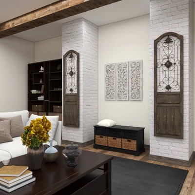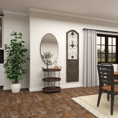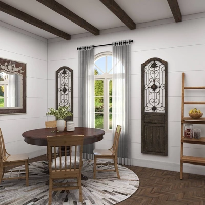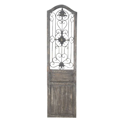 - •Wood and metal rectangular wall door panel with an arched top features a brown distressed wood finish