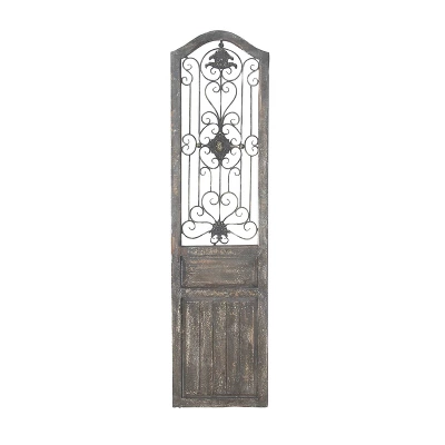 - •Vertically oriented panel features a distinguished look from its distressed wooden garden gate design and metal scroll details