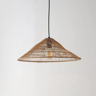 - This natural rattan swag light features a brown conical shade for a retro, mid-century vibe