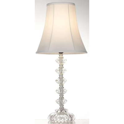 An elegant table lamp with a bohemian inspired style. Clear stacked glass detailing add a chic touch to the base. While an off-white lamp shade will complement any style decor.