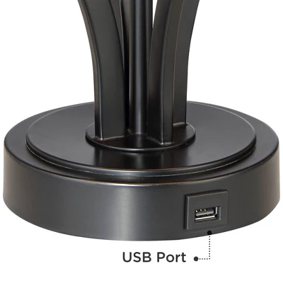 This set of two iron table lamps add understated style to your living space. From the designers at 360 Lighting, this pair of lamps is accented with a USB port in the base of each, offering an easy spot to charge a smart phone or tablet. Each lamp boasts a dark finish with a trimmed drum shade. Each lamp has a 8″ square riser.