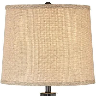 - Dark iron finish. Iron construction. Burlap shades have an 8 1/2″ harp. 8-foot long brown cords.