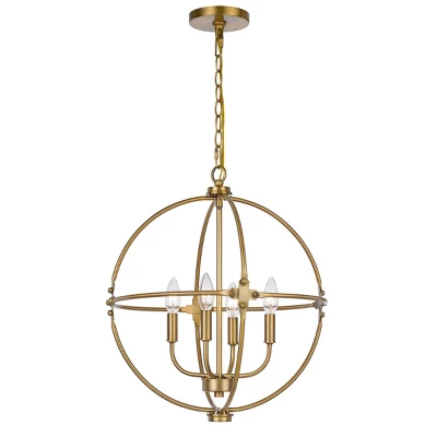 Cal Lighting’s Sheffield metal 4 light chandelier uses 60W chandelier base bulbs (not included). This chandelier comes with a matching canopy, 6 feet of chain on a 10′ cord. The Antique Brass chandelier will be a great addition to your dining room or bedroom, This chandelier is 36″ wide and 21″ tall. This item requires hardwire installation.