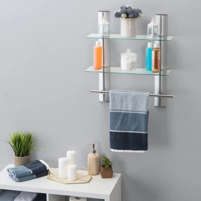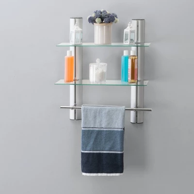 This modern and elegant wall mounted adjustable shelf system with tempered glass shelves and aluminum frame and towel bar is great for those who never seem to have enough storage space in their bathrooms. By going vertical you can free up your countertops and make your bathroom a happy place once again. With the adjustable design, you can shift the shelves higher or lower to store and display items of varying sizes. A versatile bathroom accent that will infuse visual interest into your bathroom.