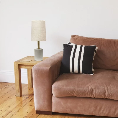 Bring a modern and industrial touch to any room in your home while keeping it simple! The cement base is beautifully accented by antique brass for a hint of elegance, complimented by a white fabric shade. This is the perfect size lamp for your night stand, end table or office desk!
