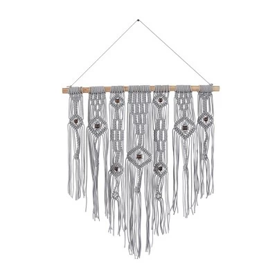 Maximize your open wall and eliminate any negative space with this eye catching wall decor. An extravagant display in a captivating design to elevate the look of your home. Instantly add a beautiful bohemian vibe to your room with this gray macrame woven wall decor that you can easily hang anywhere. This item ships in 1 carton. Can be hung vertically using the cotton cord; nails and screws not included. Suitable for indoor use only. This item ships fully assembled in one piece. Made in India. This is a single gray colored wall sculptures. Bohemian style.