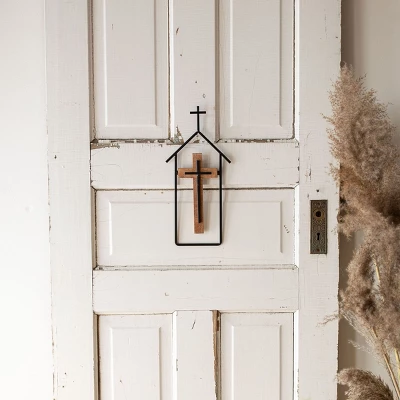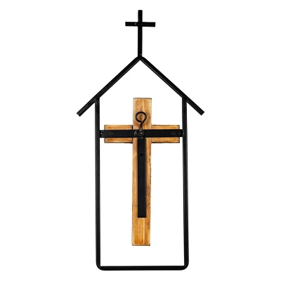 This simple, yet bold cross wall hanging is the perfect traditional accent for any space in the home. A sleek black metal frame in the shape of a house, paired with a warm toned wooden cross accented by a black metal cross layered on top creates a dynamic piece of art.