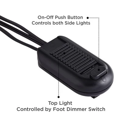 - Foot operated cord switch with dimmer for top light and on/off button for side lights. Switch box located 5′ from base.
