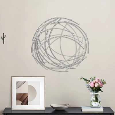 Transform your living space with a distinctive abstract wall decor that is truly one-of-a-kind. This piece boasts a captivating swirl design with a refined wire pattern in a silver tone finish, making it a stunning addition to your home. The metal sculpture is meticulously crafted by hand and features multiple metal tubes of varying thicknesses, resulting in a beautifully imperfect yet brilliant wall decor. This visually appealing piece complements any contemporary-inspired decor and arrives ready to hang, making it perfect for adding personality to empty walls in your entryway, living room, or dining room.