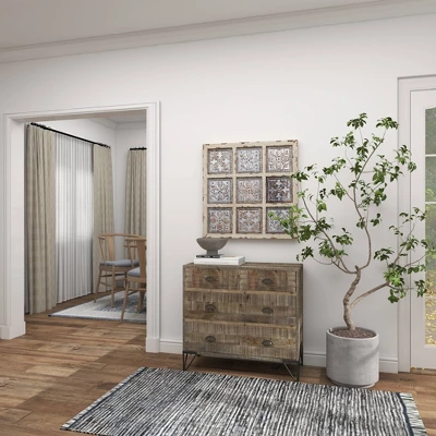 - •This large metal wall art piece adds the antique aesthetic design you’re looking for with the juxtaposition of distressed, chipped-paint wood against cool metal with a rust-look finish