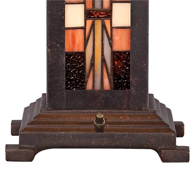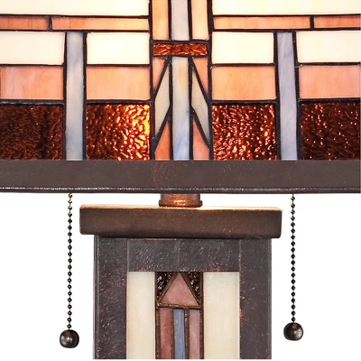 Equally at home in rustic or vintage decors, this Robert Louis Tiffany table lamp features clean, minimal lines that make it great for living rooms, offices, and bedrooms. The Mission-inspired design features a masterfully crafted geometric Tiffany-style shade with 160 pieces of hand-cut art glass, The glass has been assembled using the traditional Tiffany-style copper foil technique. The lamp has a built-in night light option that provides safe illumination during the darker hours. Slight variations due to the natural tone and pattern of art glass make each shade unique.
