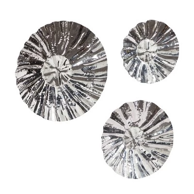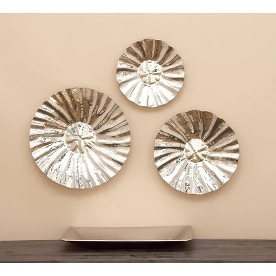 This kitchen platter decor will stand out when displayed on empty walls in your living room with matching decor and colorway. This item ships in 1 carton. Features three decorative wall platters in various sizes. Can be hung vertically using the D-rings on the back; nails and screws not included. Suitable for indoor use only. This item ships fully assembled in one piece. Made in India. This silver colored wall sculptures comes as a set of 3. Glam style.