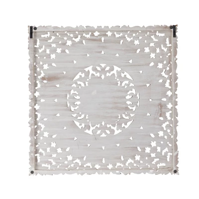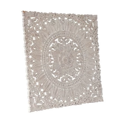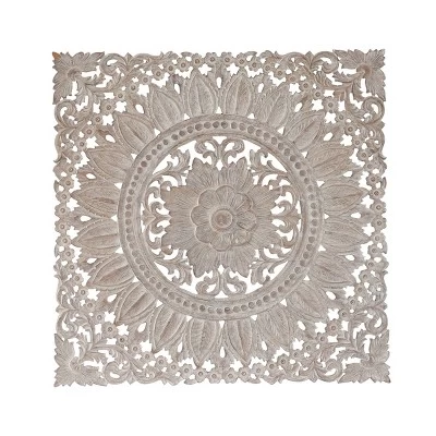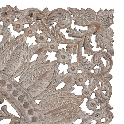 - Square wood wall decor features a medallion-inspired pattern of flowers and leaves